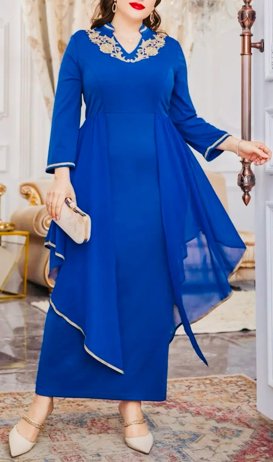 Robe longue brodée « Shéraz » style oriental, fendu à l’arrière et manches longues, col en V et fermeture ; longue jupe droite bordé de voile tombant.